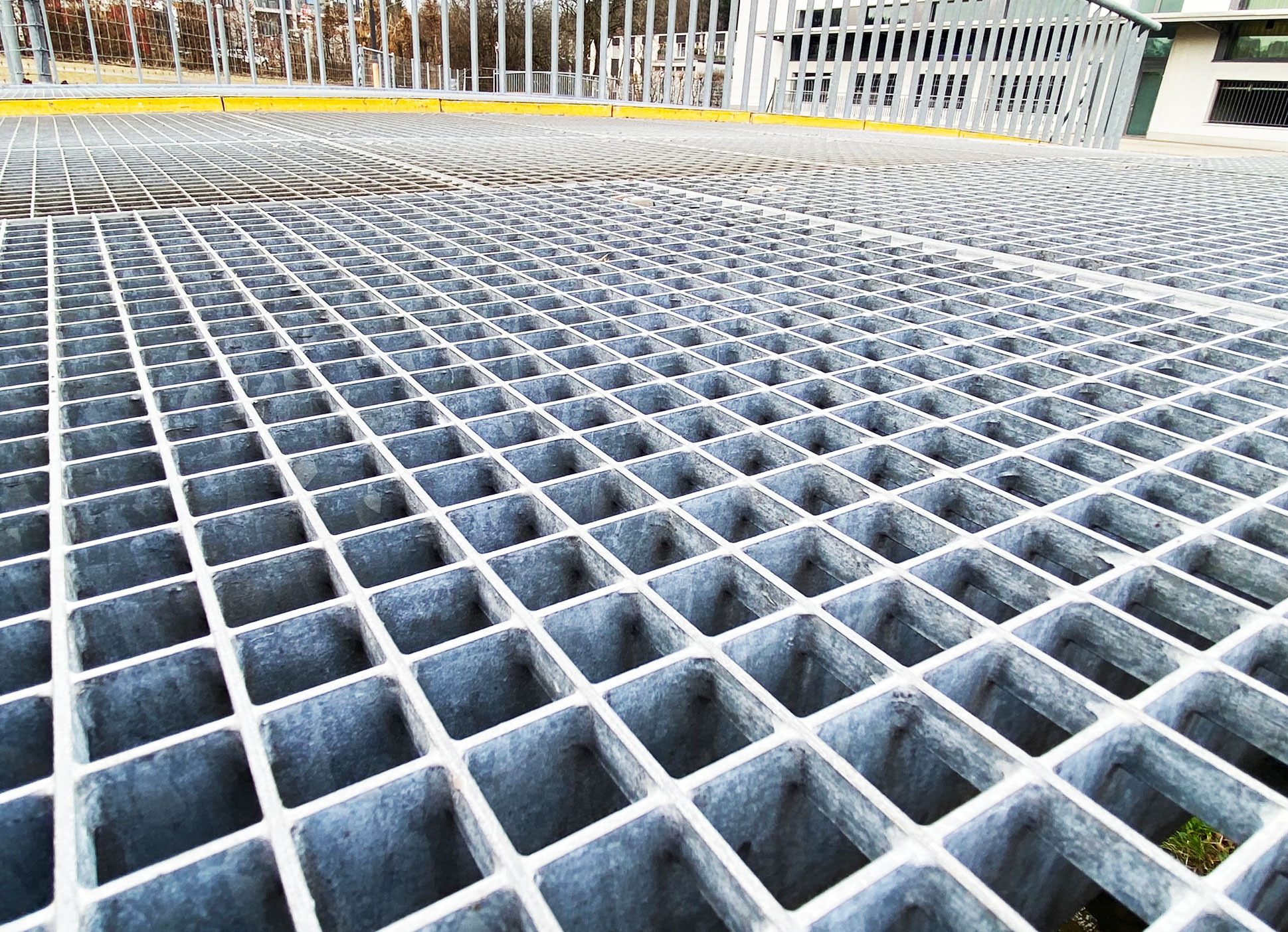 Les caillebotis pleins ne sont pas plus solides. La différence avec les caillebotis pleins est que les deux barres ont la même hauteur. La plupart du temps, les caillebotis pleins sont utilisés pour les balustrades ou les façades. Sur les caillebotis pressés habituels, les barres transversales ont une hauteur d’environ 10 mm.